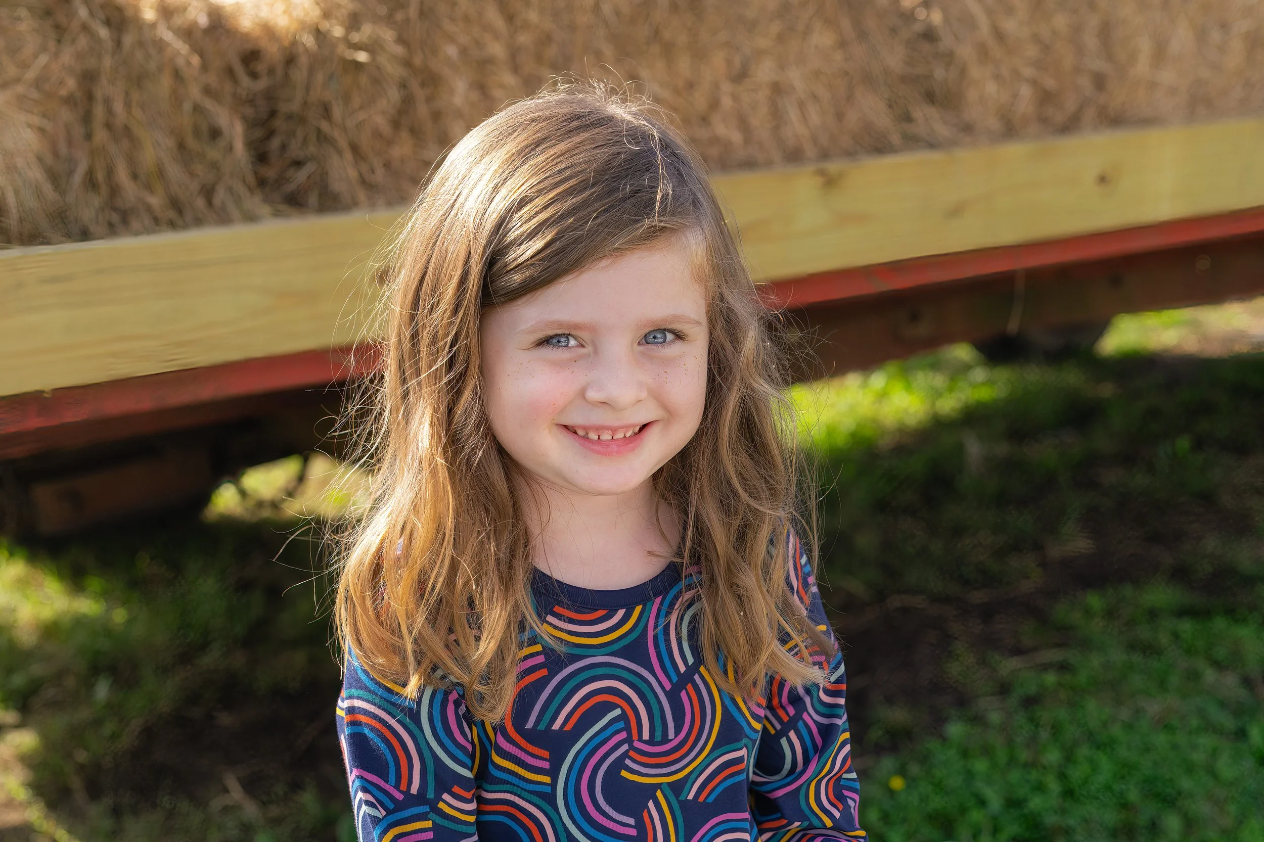 A young girl with long, wavy, light brown hair and bright blue eyes smiling outdoors on a sunny day, standing in front of a wooden structure with hay on top, and green grass below.