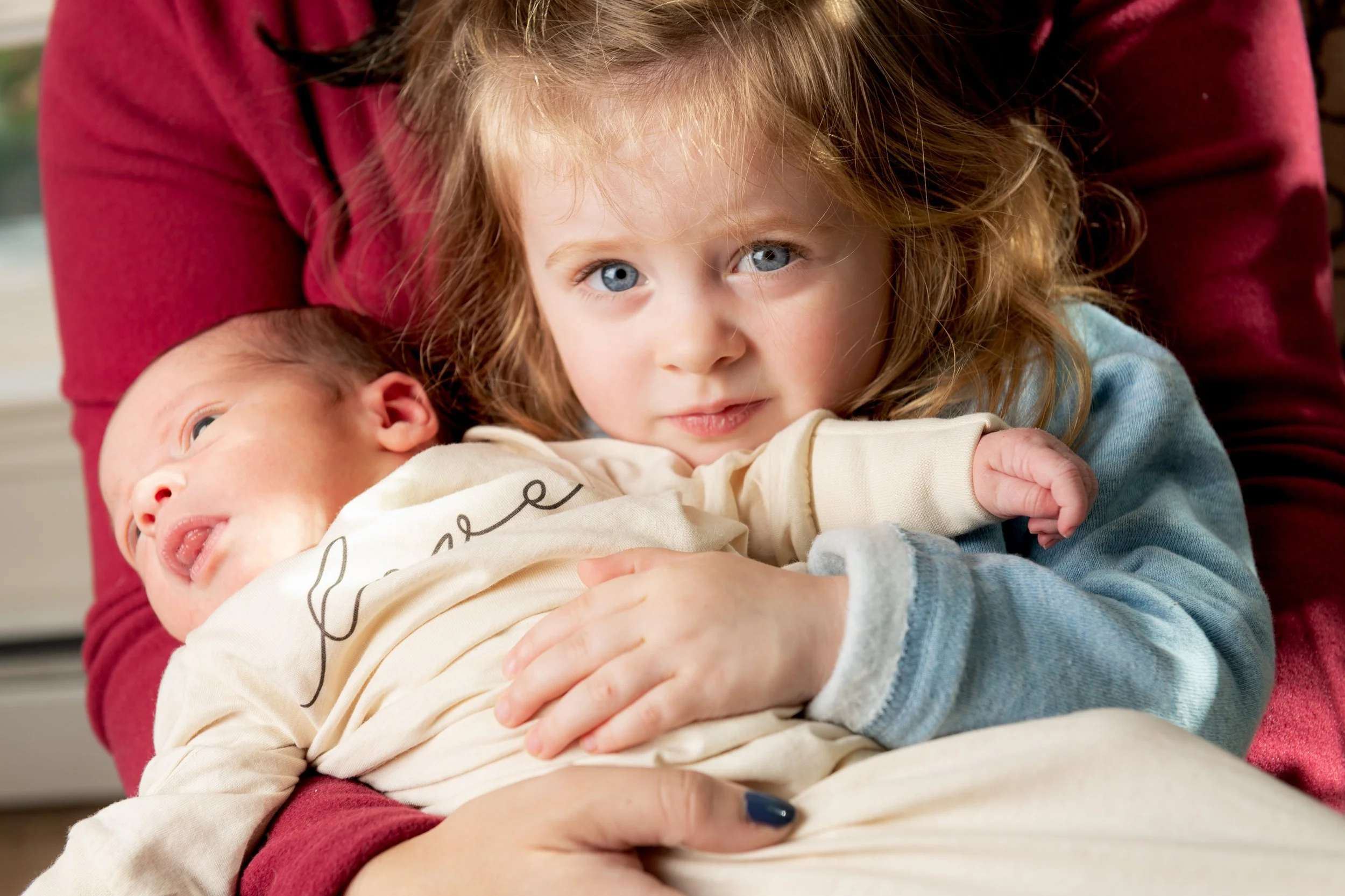 A young girl with curly blonde hair and blue eyes holding a baby in her arms, both sitting on a person's lap, inside a house.