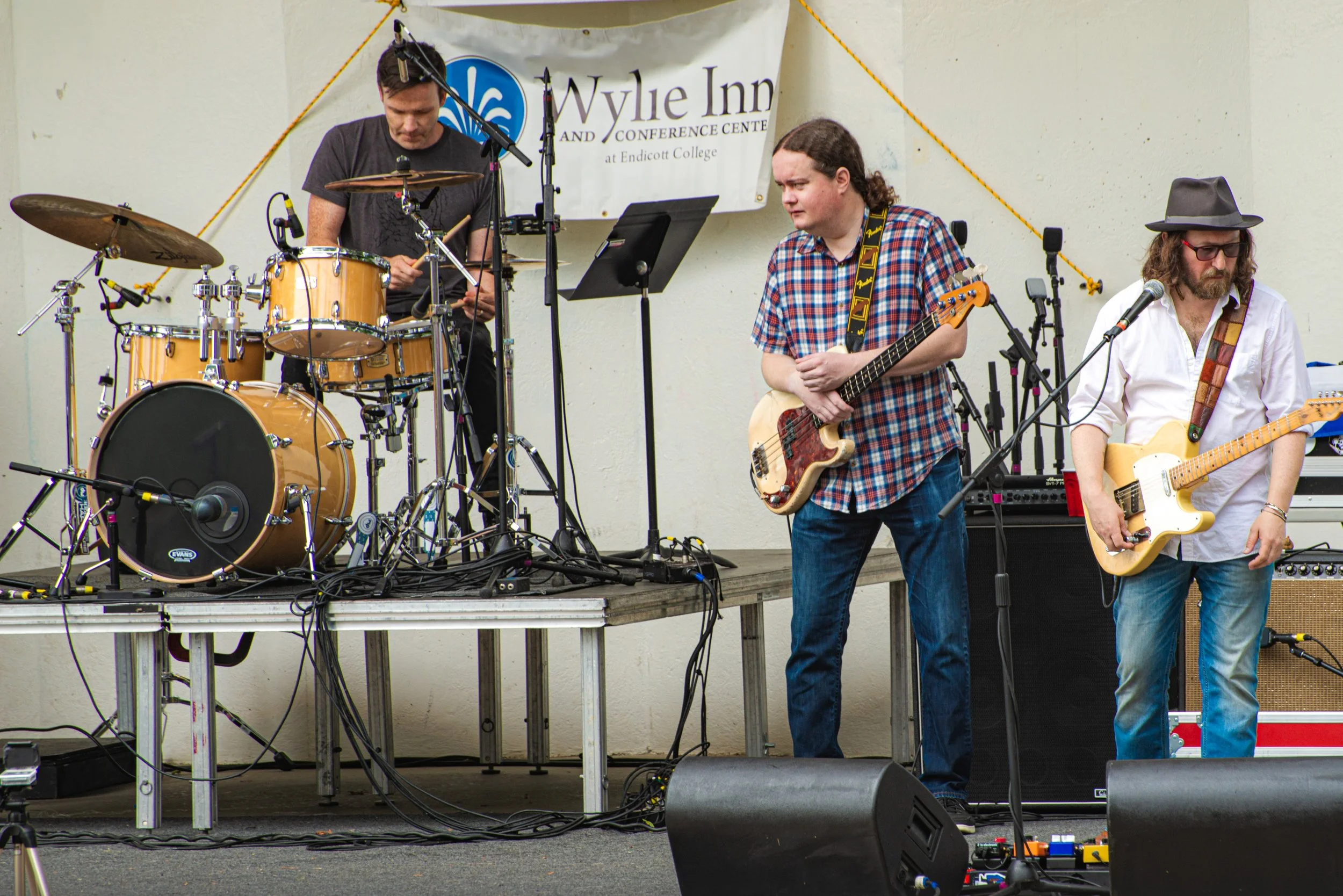 Three musicians performing on an outdoor stage, with a drum set and guitar amplifiers, during a live music event, with a banner in the background reading "Wyle Inn and Conference Center".