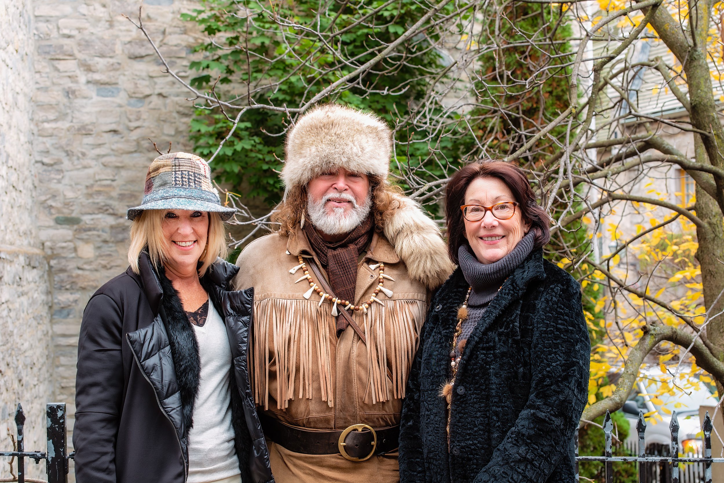 Three adults standing outdoors near a stone wall and leafless trees, smiling at the camera.