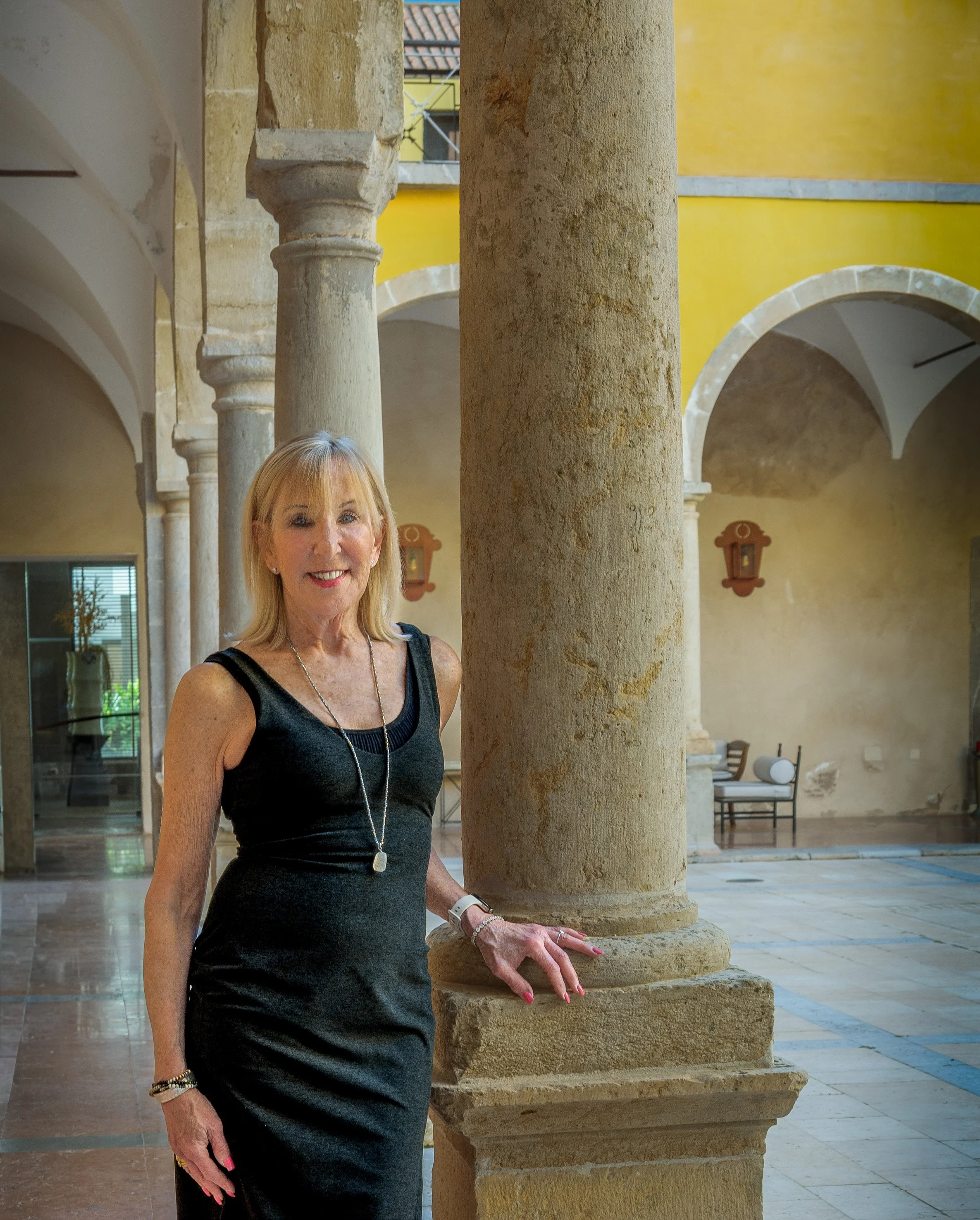 A smiling woman with blonde hair wearing a black sleeveless dress, standing indoors near a large stone column in a historic or classical building with arches and a yellow wall in the background.