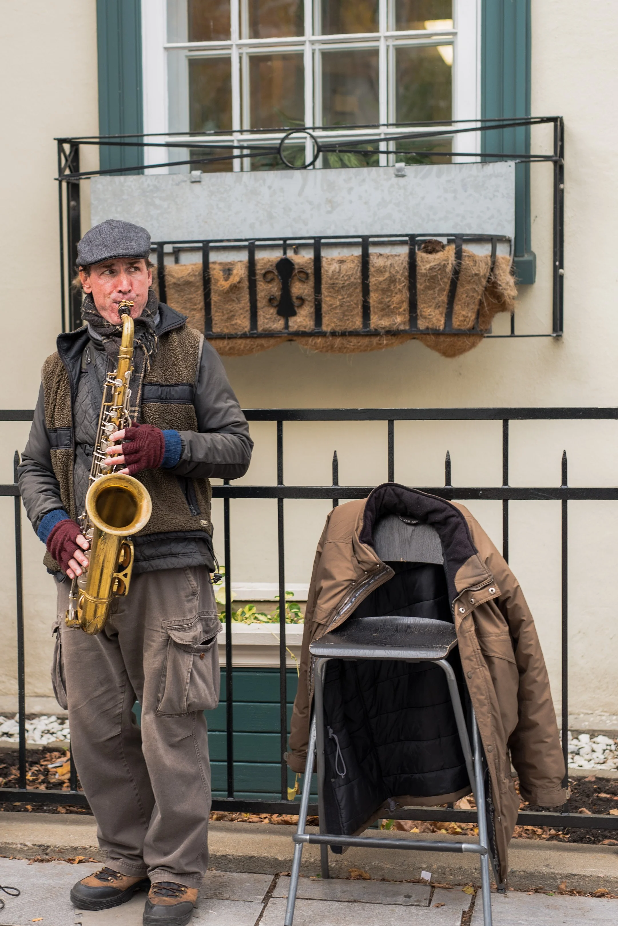A man playing a saxophone on a sidewalk near a black metal fence, with a coat draped over a chair beside him, and a window with a balcony in the background.