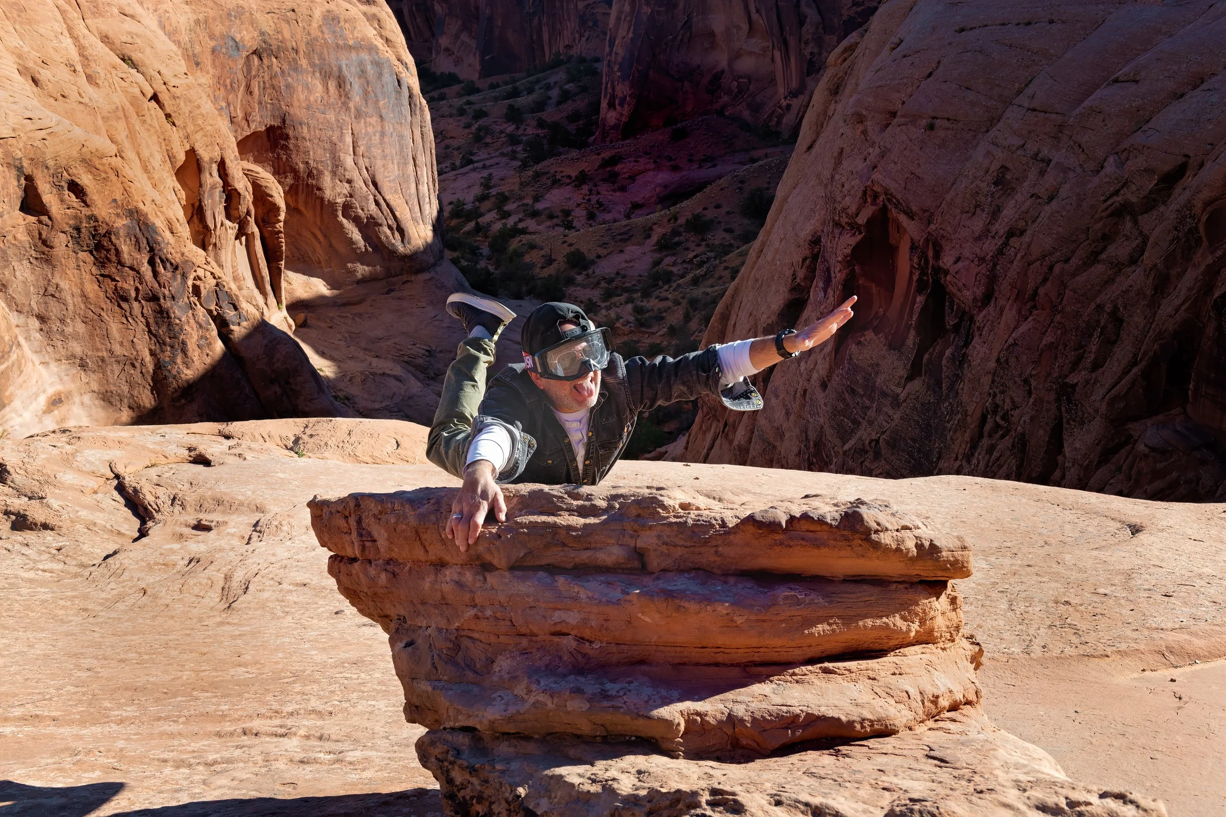 A man wearing a black jacket, glasses, and a helmet with goggles is lying on a large rock in a desert canyon, reaching out with his right hand, with tall red rock formations in the background.