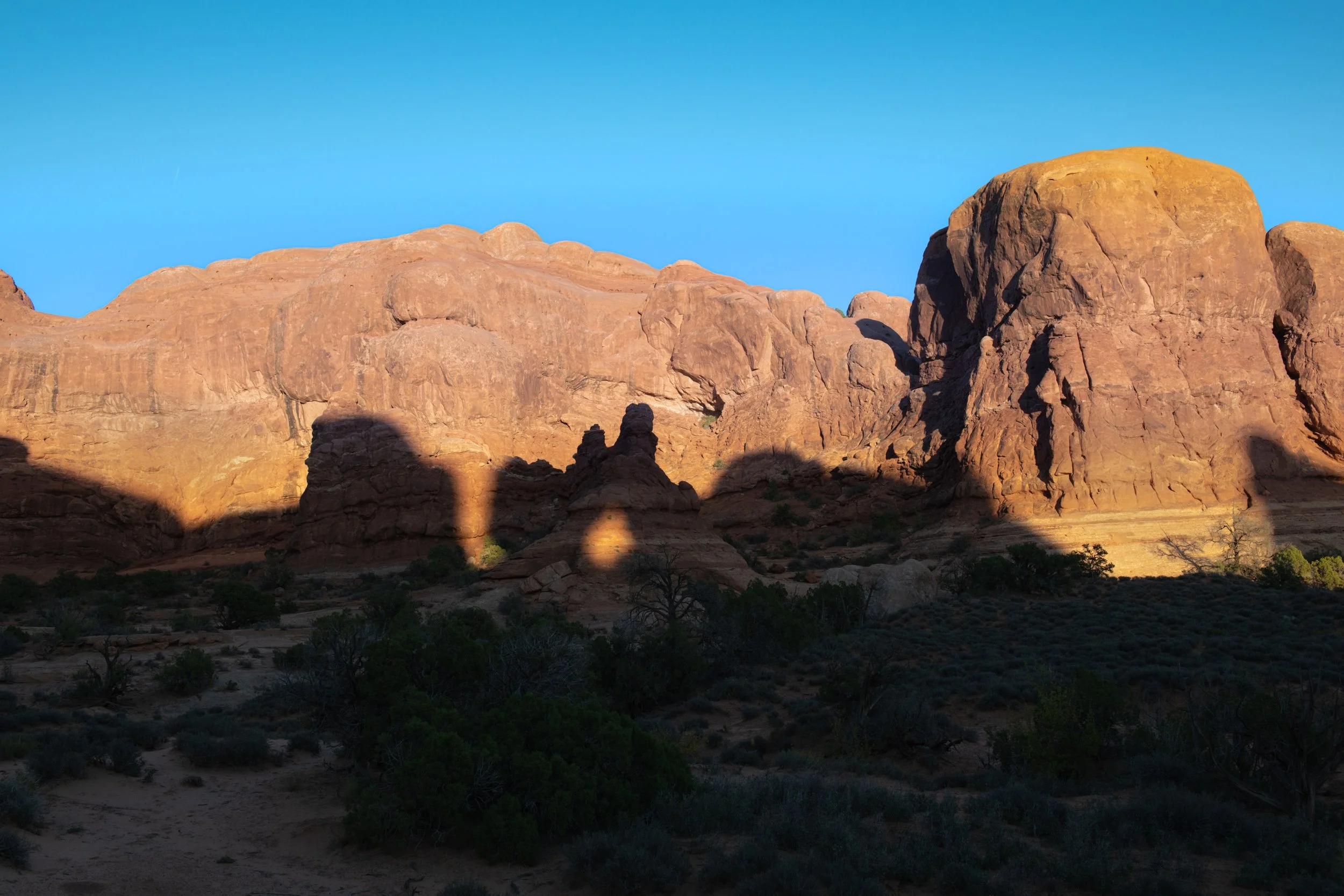 Sunlit red rock formations in a desert landscape with sparse vegetation under a clear blue sky.